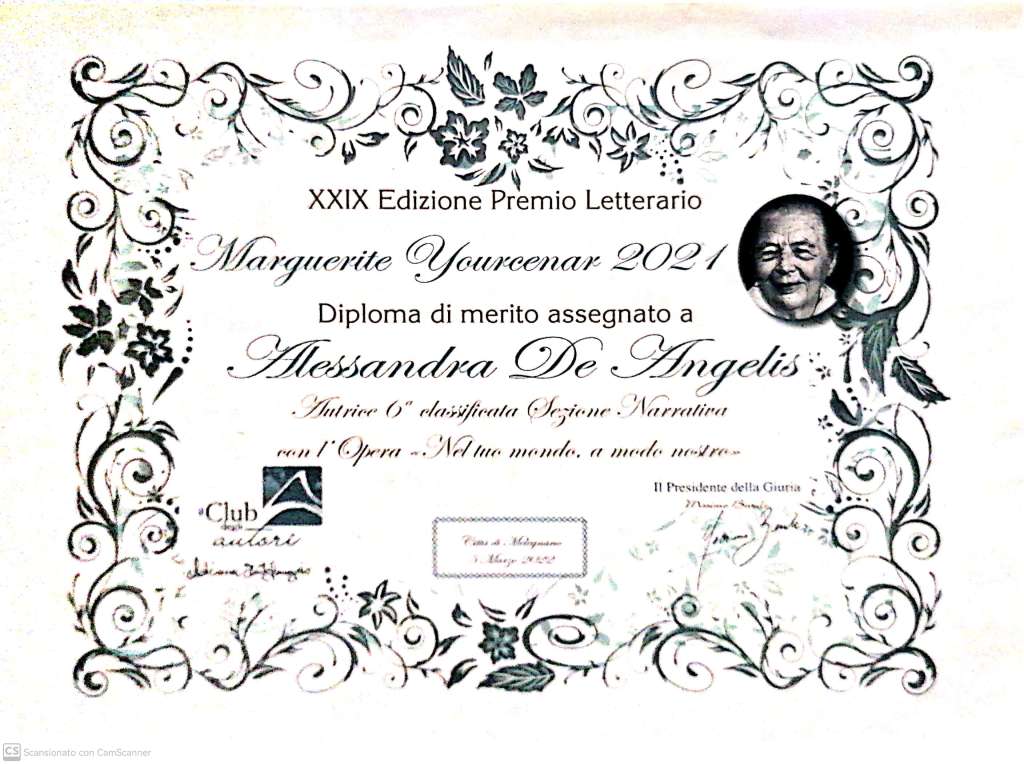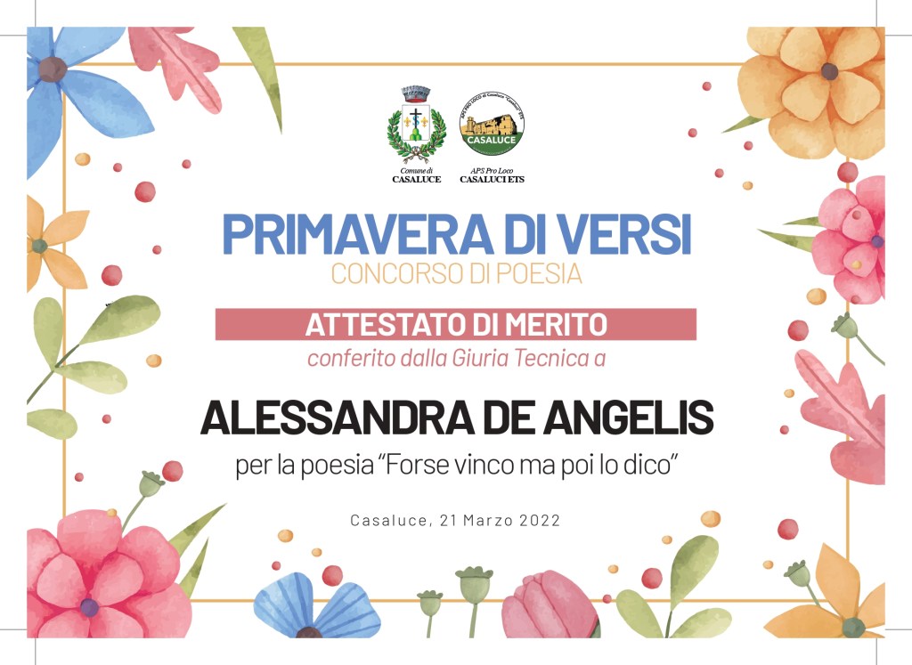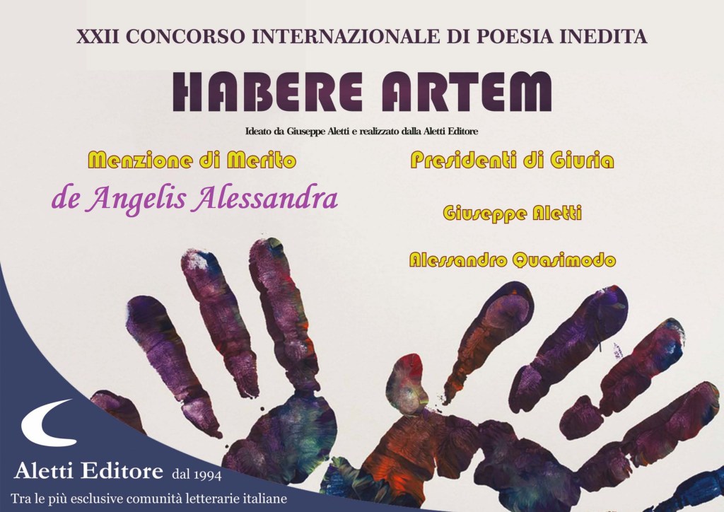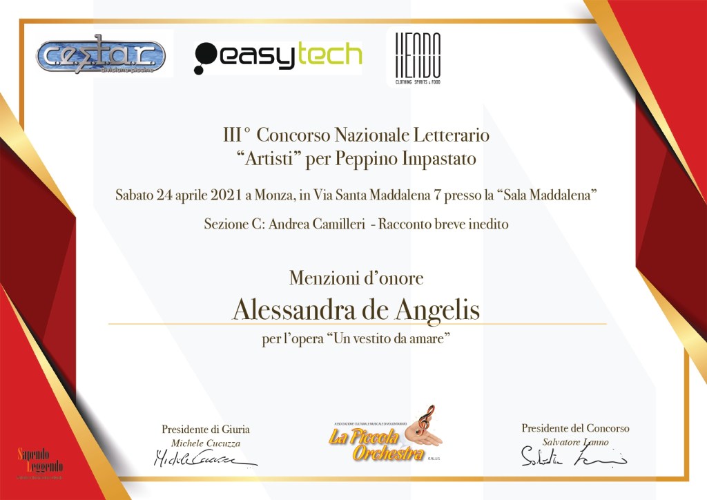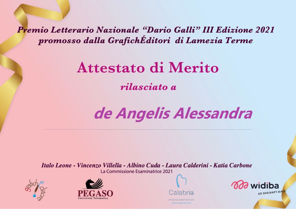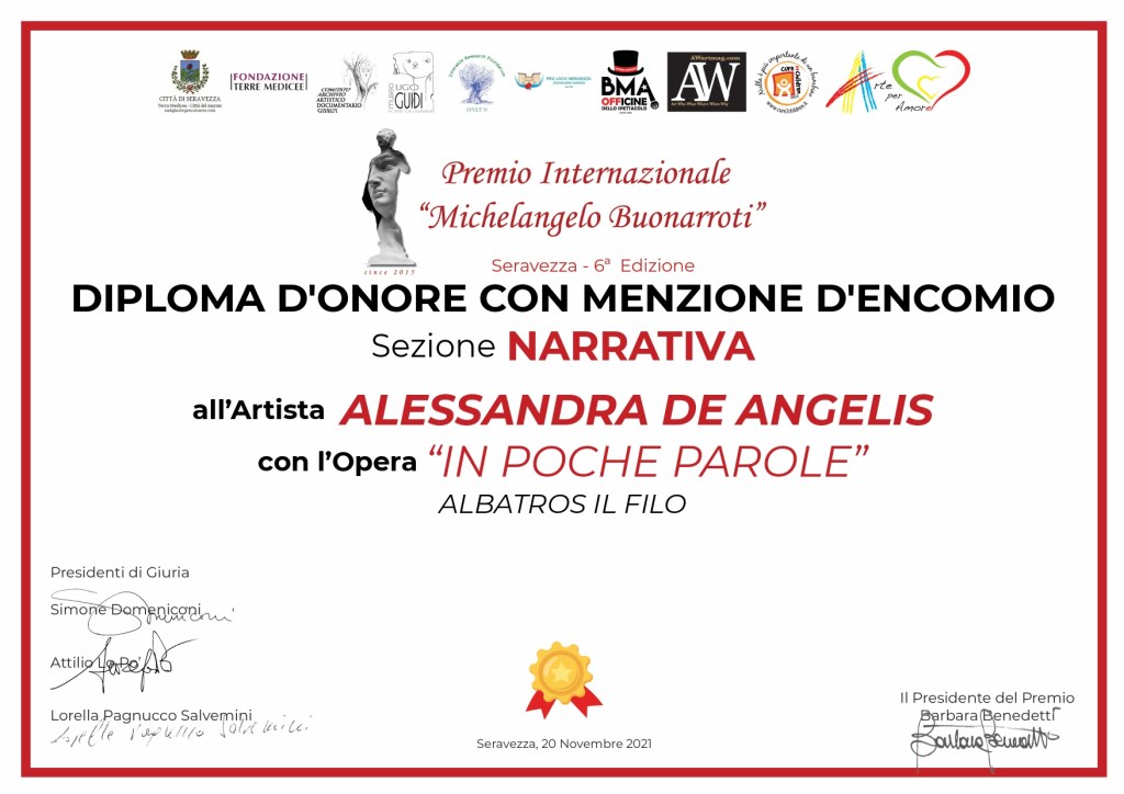 - Concorso Internazionale di poesia e narrativa “Memoria della quarantena”, I Edizione 2021, finalista e pubblicazione nell’antologia con uno degli aforismi presenti in “Un po’ miei … un po’ vostri., de Angelis Alessandra, Abrabooks editore, 2020.