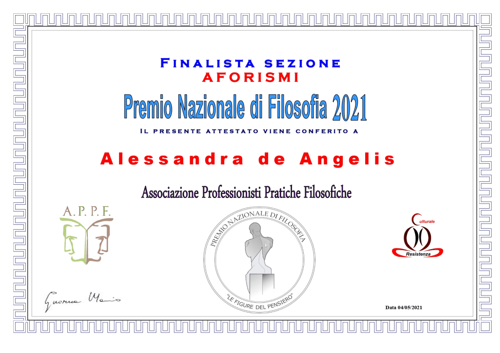 - Le figure del pensiero, Associazione Professionisti Pratiche filosofiche, Giuliano Landolfi Editore, Aforismi vari di Alessandra de Angelis